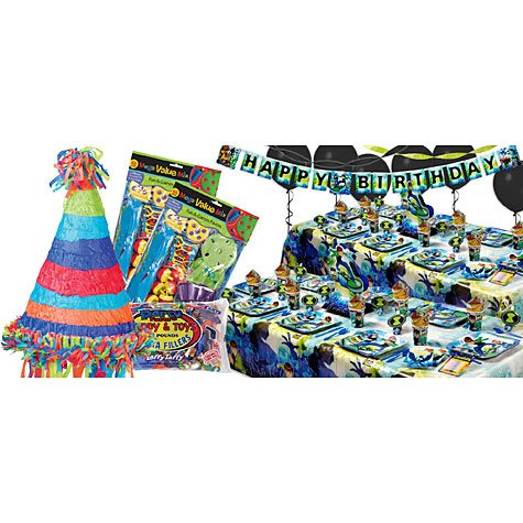 The Ben 10 Ultimate Party Kit includes: 16 Ben 10 Lunch Plates, 16 Ben 10 Lunch Napkins, 16 Ben 10 Paper Cups, 2 Ben 10 Plastic Tablecover, 16 Plastic Blue Forks, 16 Plastic Blue Spoons, 16 Plastic Blue Knives, 16 Ben 10 Invitations, 16 Ben 10 Blowouts, 1 Ben 10 Banner, 2 Ben 10 Centerpiece, 20 Black Balloons, 1 White Curling Ribbon 66ft, 1 Kiwi Crepe Streamer 81ft, 1 Black Crepe Streamer 81ft, 24 Birthday Candles, 2 Party Favor Value Pack, 1 Birthday Hat Pinata, 1 Pinata Bat, 1 Pinata Blindfold, 1 Pinata Filler